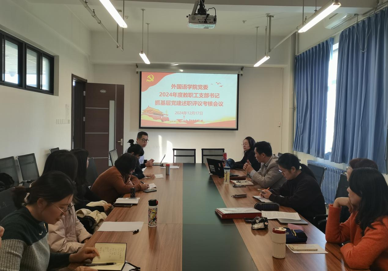 为深入贯彻落实习近平新时代中国特色社会主义思想和党的二十届三中全会精神,进一步树立大抓基层鲜明导向,12月17日13时在主C701,外国语公司党委召开2024年度教职工支部书记抓基层党建述职评议考核会议。会议由学院领导班子、党委委员、团委书记、分工会副主席和教师代表组成的学院考核工作小组担任评委,公司党委副书记马冬主持。
