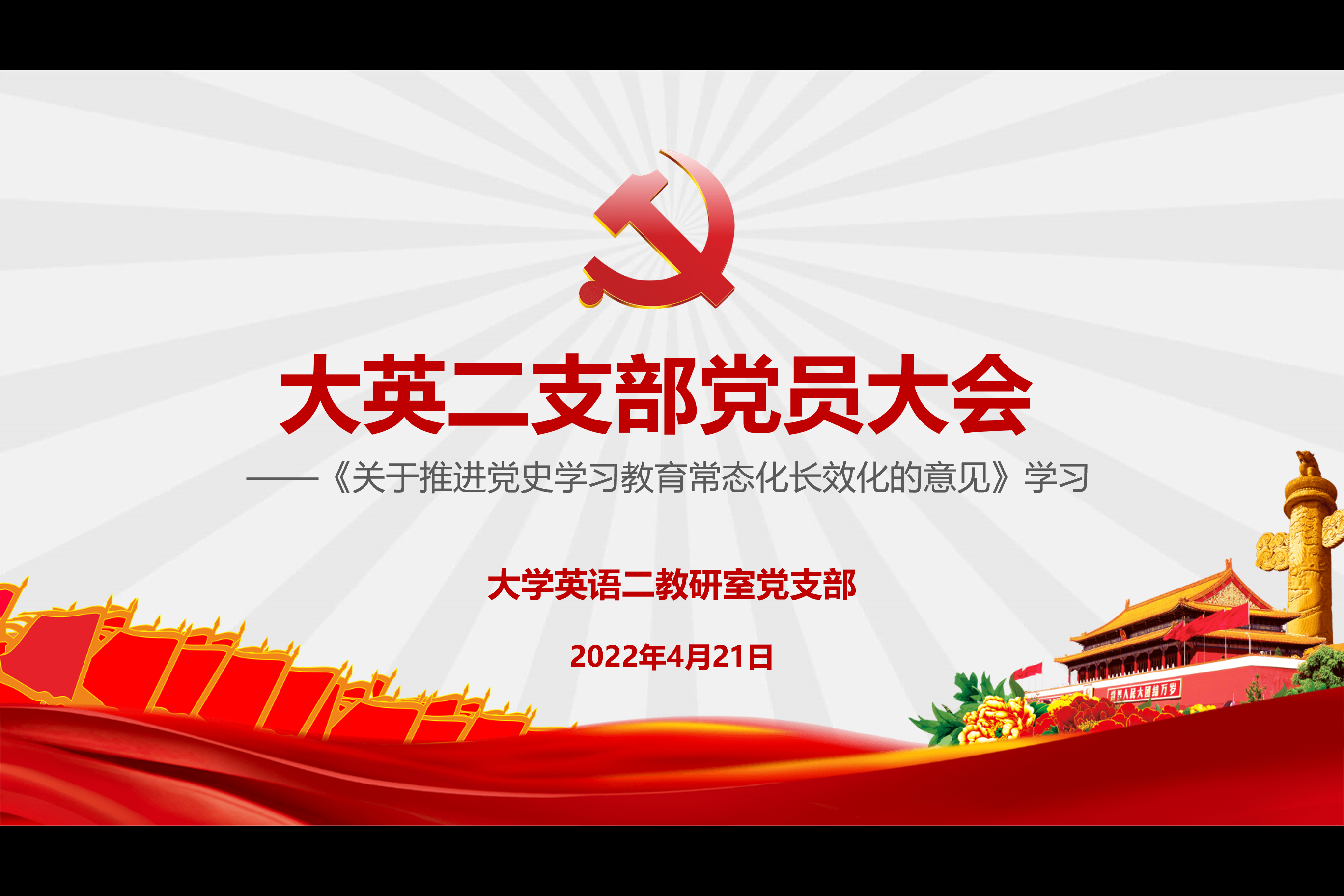 为了传达学习贯彻中共中央办公厅印发的《关于推动党史学习教育常态化长效化的意见》,大英二党支部于2022年4月21日中午1点,以腾讯会议的方式线上召开支部党员大会。会议由支部书记王欣主持,全体党员教师参加了会议。