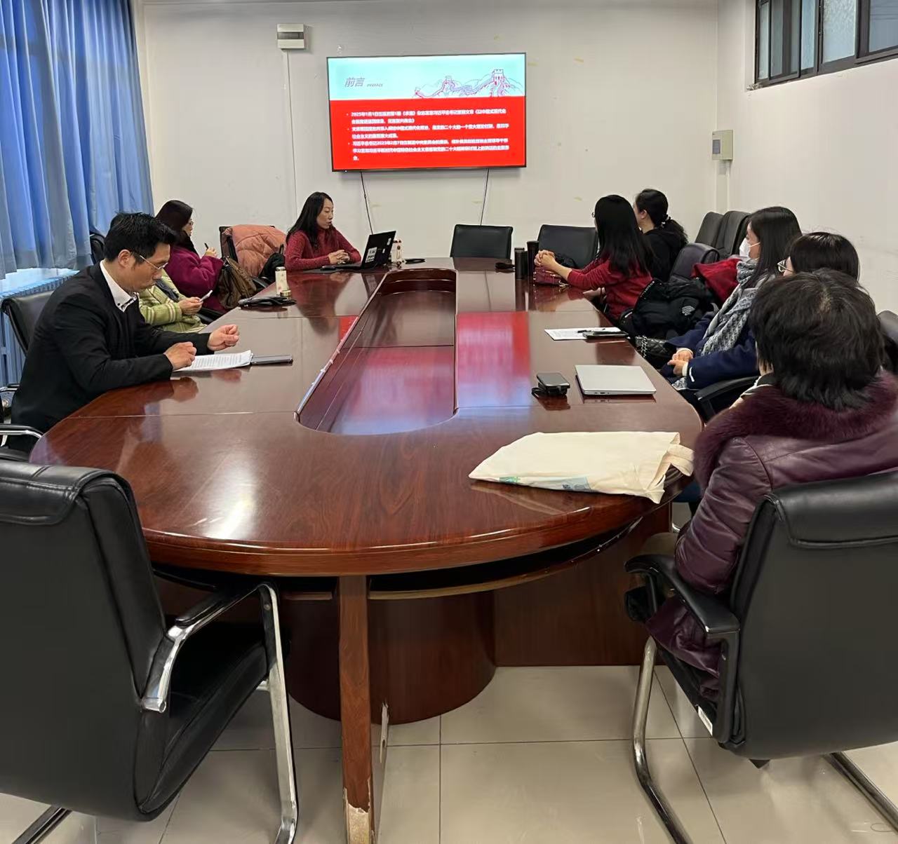 2025年1月7日上午,大学英语二教研室党支部在主C501进行了支部党员理论学习活动。本次理论学习以“领会中国式现代化深刻内涵,提升‘理解当代中国’课程思政能力”为主题,深入学习了2025年1月1日出版的第1期《求是》杂志发表的习近平总书记重要文章《以中国式现代化全面推进强国建设、民族复兴伟业》。通过学习,支部党员们深入理解了中国式现代化主题,领会了中国式现代化的深刻内涵,提升了自身的理论素养,拓宽了课程思政的思路。