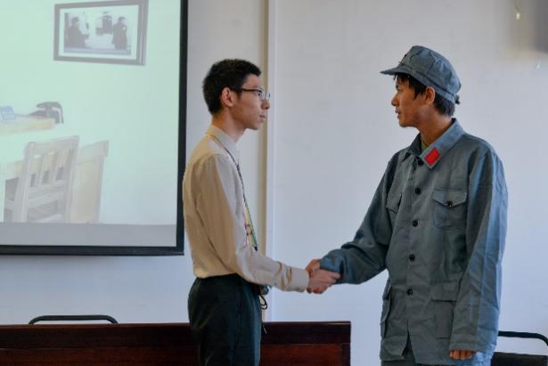 随后,本科生党支部党员同学以英文话剧的形式表演了《红星照耀中国》记述的有关埃德加·斯诺初识周恩来的主要情节,生动地向大家复刻了他在中国苏区的经历,以鲜活的方式将党史学习教育植入全体师生的心田。