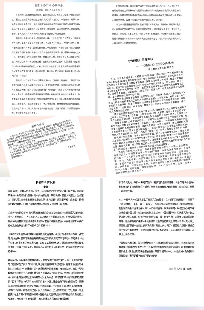 与会党员围绕自身所思所感也纷纷进行了发言,皇甫伟老师赞扬《榜样5》专题片贴近群众,接地气,展现了疫情下优秀共产党员的光辉,作为基层教师党员,这些英雄榜样值得我们学习;韩嫣老师看过专题片后深受感动,时光又似回到了一年前的艰难时刻,她呼吁道疫情并未完全结束,我们要学习榜样的精神,继续努力;尹宇老师动情的回忆了去年武汉一些平凡岗位上的普通人的无私付出,尤其是疫情中社区书记的艰辛和参与火神山雷神山建设的普通人;金英老师在感恩榜样人物的同时,严格要求自己,做好本职工作之外,积极成为社区党员志愿者发光发热;周轶欧老师结合自己近期的隔离经历,为我们讲述一线防疫人员工作的辛苦,他们的工作覆盖到各个细节,平凡而伟大;张诗卉老师致敬了在疫情战役中年轻人的牺牲奉献,这些90后00后用稚嫩的肩膀撑起了一片天。
