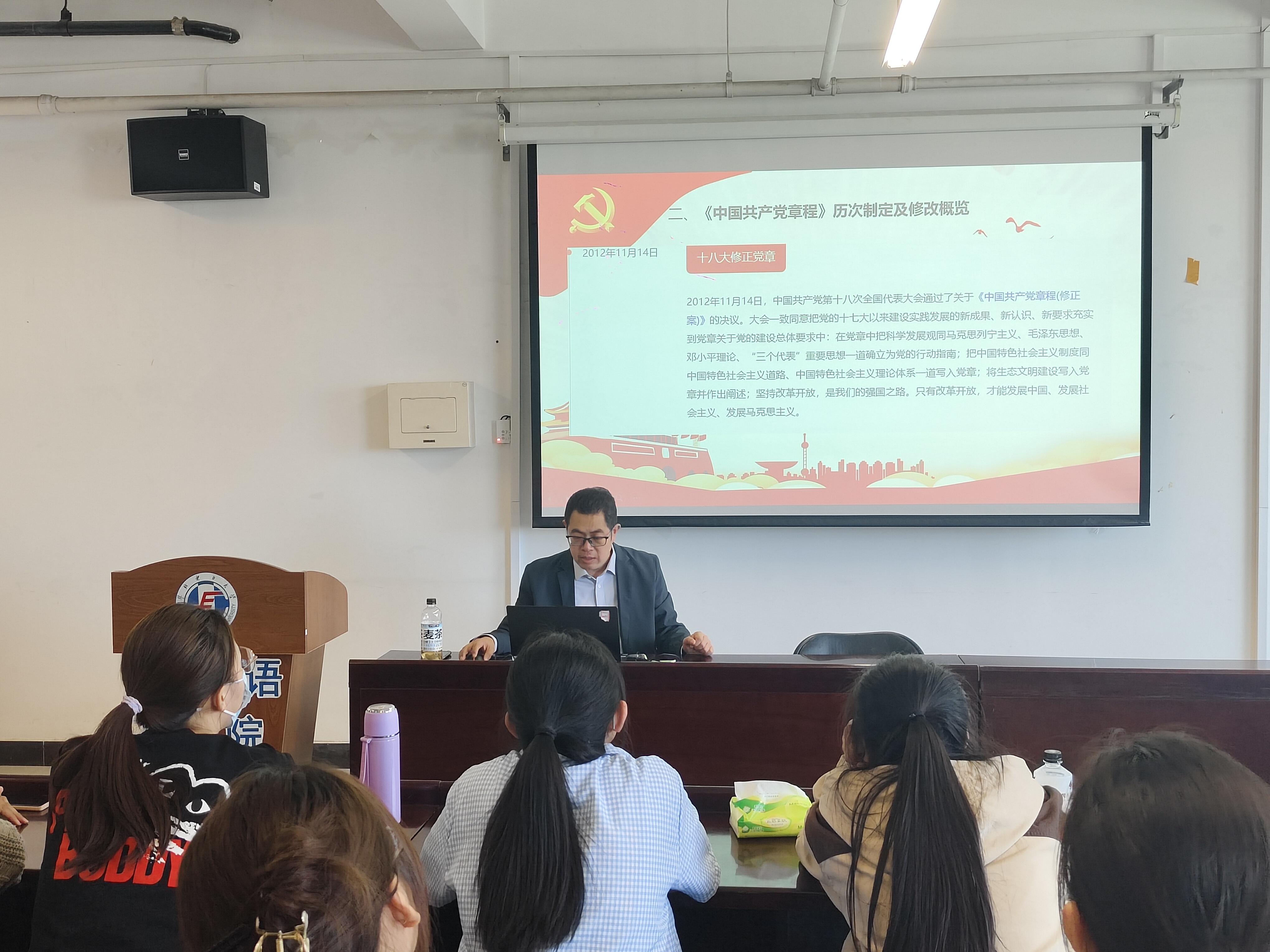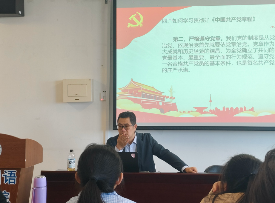 为深入学习贯彻习近平新时代中国特色社会主义思想,进一步强化入党积极分子的政治素养,引导青年学子深刻学习并理解党章,4月16日中午,外国语公司党委在主C606会议室组织开展学习《中国共产党章程》专题党课,本次党课由公司党委副书记马冬主讲,学院第57期入党积极分子参加学习。