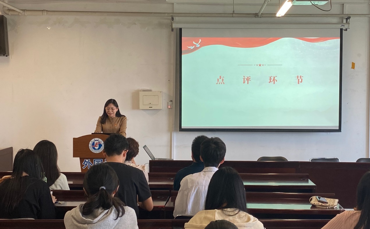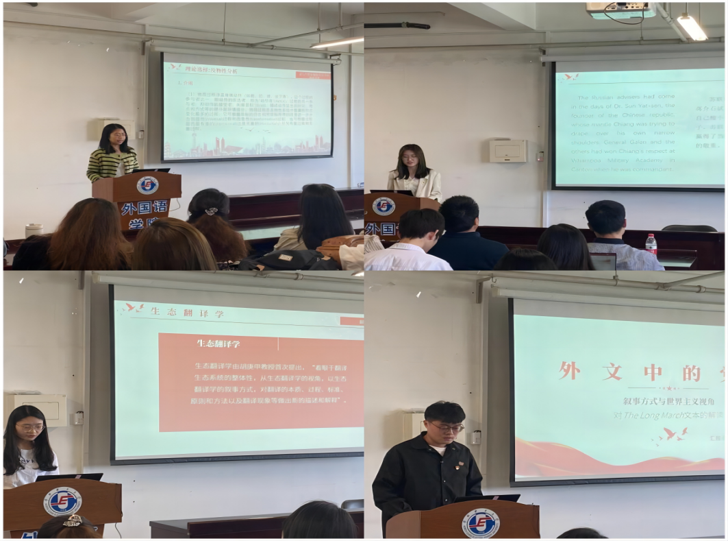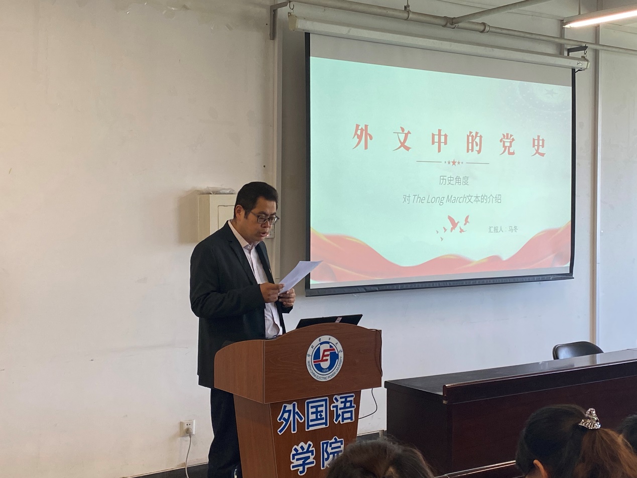 研究生党支部代表从翻译实践、翻译学、语言学和文学四个专业方向进行了深入又系统的学术阐释。翻译实践组杨雨蒙对《长征》一书片段翻译进行详细的解读,译文流畅通顺、忠实原文,体现了译者扎实的翻译功底;翻译组石文娜从生态翻译学角度出发,从语言维、交际维、文化维“三维”转换的角度出发。她提到,“三维”转换能够兼顾原文的信息和形式,满足目标语读者的期待和需求,帮助译者产出最佳译文;语言学组伏鑫悦从系统功能语言学的及物性视角对文本进行解读,并对长征的意义描写进行了及物性分析,表达了作者如何用物质性过程表达长征在中国历史上的重要地位和影响,揭示了及物性体统如何有效地在文学作品中实现对长征这一事件意义地构建;文学组张浩从叙事角度和世界主义两方面进行介绍。他认为《长征》一书以“一路追踪”为叙事线索,将焦点聚集到长征中的每一个故事,采用“情景再现”的写作手法探寻了长征的整个过程,全面再现了此段历史。其语言洗练,准确生动,使读者产生了强烈的真实感和历史感。并以文本中的两个例子生动说明了书中如何体现了博爱、平等以及世界和平概念的普世性这一“世界主义”意识形态。
