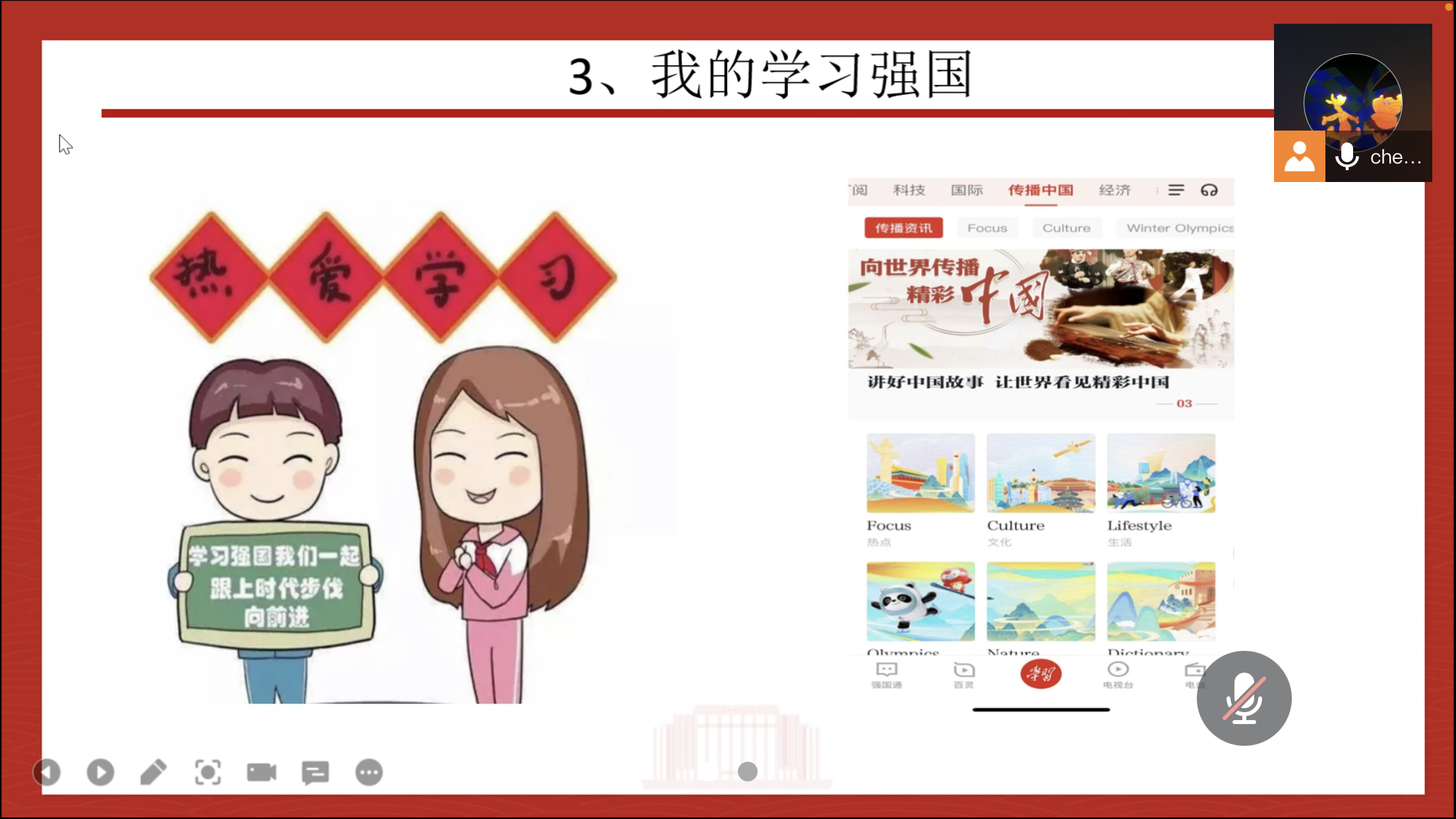 接着,就本次党日活动主题“我的学习强国”,各位党员依次分享了自己的学习经验,以及最喜欢的板块或内容。与英语教研相结合的慕课及中英双语报道、弘扬中国传统文化的版块及资料、以及时事政治版块成为普遍受欢迎的内容。党员们一致认为,可以从学习强国APP中发掘出提升个人政治文化素养、提高教研水平的许多资源。陈蓓书记在总结中鼓励党员同志拿出更大的热忱,加强学习,跟上时代步伐。
