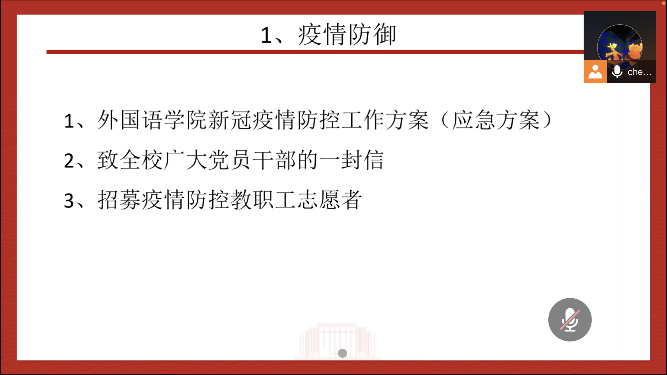 本次会议主要分成四个部分。首先,陈蓓书记就之前下发的疫情防御、师风师德教育学习文件进行了要点解读。陈蓓强调,支部党员要高度重视疫情防御工作,严格遵守学校相关要求,并熟悉应急方案处理办法,保证教学工作平稳进行。在师风师德教育方面,陈蓓督促一线教师要认真对待每一堂课,并介绍了教务处和党支部后续进行师风师德培训的部署安排。