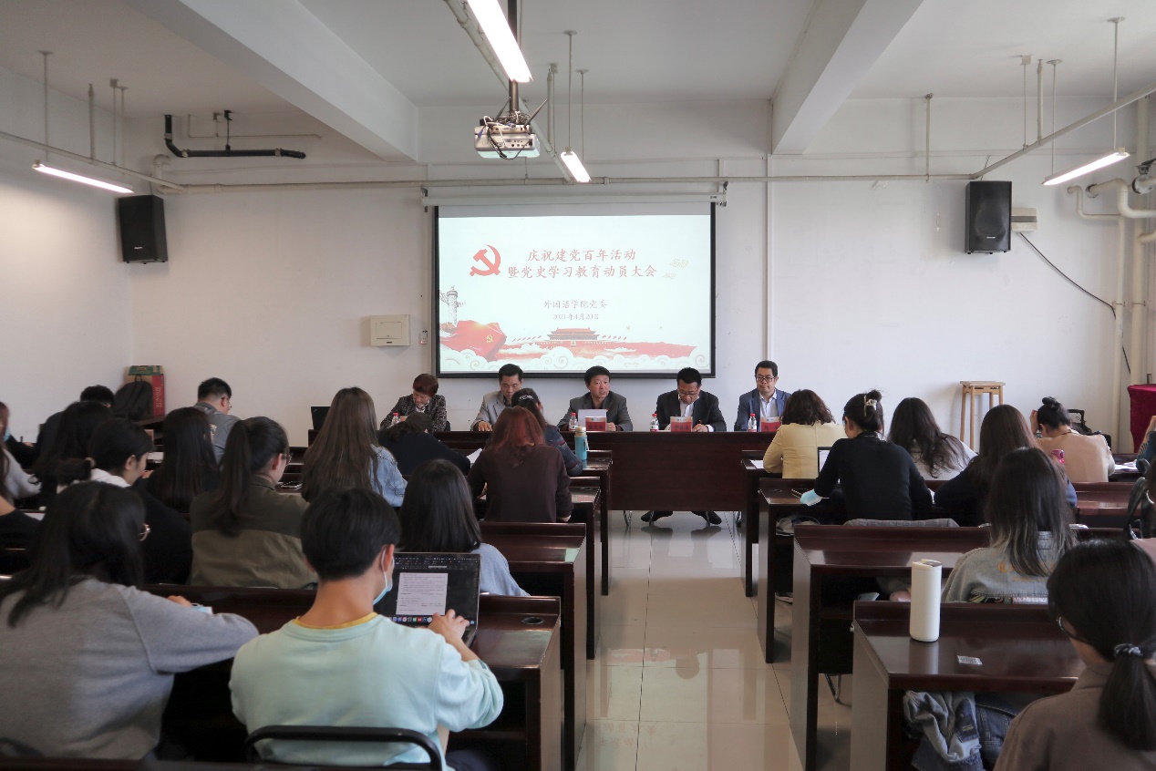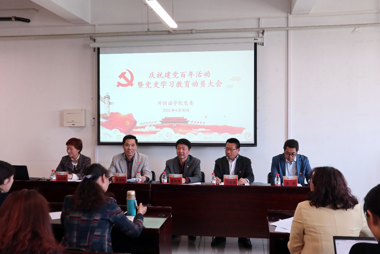 为深入学习贯彻党史学习教育动员大会上的重要讲话精神,扎实推进党史学习教育,4月20日,外国语公司党委在主C606召开庆祝建党百年活动暨党史学习教育动员大会。学校庆祝建党百年和党史学习教育巡回指导组第三组组长张天兴、外国语公司党建联络员王志斌、yl23455永利集团领导班子、全体党委委员、师生党支部委员、师生党员代表共同出席会议。会议由yl23455永利集团经理、党委副书记康建刚主持。