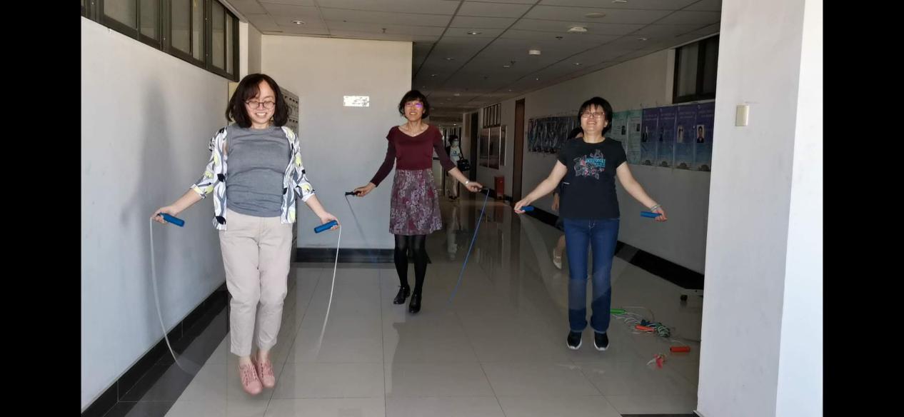 9月19日,分工会分别组织了大英一教研室、大英二教研室、翻译教研室和行政分工会小组集中活动。活动当日,主楼C座六层的楼道里热闹非凡,翻飞的跳绳在老师们的手中翩翩起舞。大家摇动一根根彩绳,每个人都一显身手,不时展示花式跳法,不甘示弱从头再来……楼道里一片欢笑声。