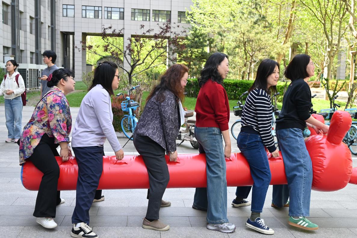 毛毛虫竞技赛训练现场同样活力满满。教师们分组熟悉道具使用技巧,有序骑上“毛毛虫”道具,同步发力、齐声喊着整齐口号向终点冲刺。针对训练中出现的配合衔接短板,大家及时沟通调整、反复磨合,在一次次练习中提升团队协作的能力,每一个认真投入的身影,都彰显着教职工们严谨务实、奋勇争先的良好风貌。