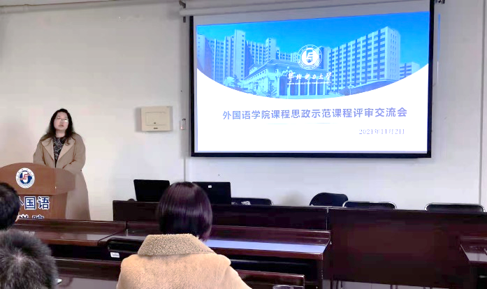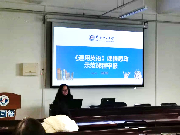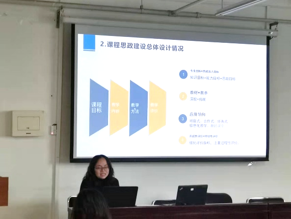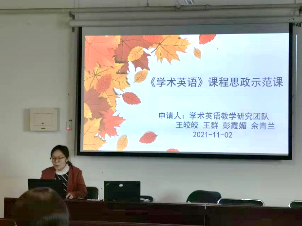 王皎皎代表《学术英语》思政团队介绍了课程建设情况,团队成员包括王群,彭霞媚和余青兰老师。王老师重点介绍了此团队教师多人多次参加校内外中青年骨干教师研修班,尤其重视课程思政方面的研修情况。根据学校和学院对课程思政提出的要求,在教学大纲的基础上融入时事政治、社会热点事件、社会热点人物等结合现实生活,注重加强道德修养,提升育人素养,落实立德树人的根本任务。讲评时有评委提问如何将历史英雄人物与课程相联系?王老师回答,曾让员工在课堂中分享参观爱国将领故居的照片并鼓励全班同学了解英雄人物及其事迹,以此来充分调动员工的积极性与自主性,落实思政建设。