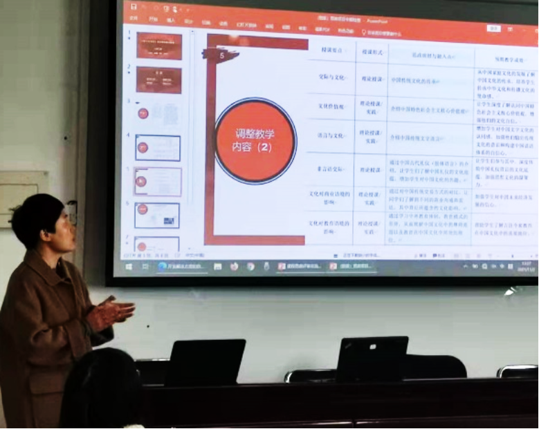 刘朝晖老师代表的《英语精读》为我们举了课堂中的实例来展示团队课程思政方面的深入研究。刘老师讨论了大学之道,大学之道在于挖掘人的优秀品德,在课堂中与员工探讨思政话题,从细微的点出发,通过让员工探讨,最终落实到深刻的话题上。这既提升了员工的英语能力,又将正确的价值观传递给了员工。刘老师还展示了英语精读课的优势例如课时长,学年长,更容易产生与员工之间的心灵碰撞,产生思想上的交流,以加强制度自信和文化自信。