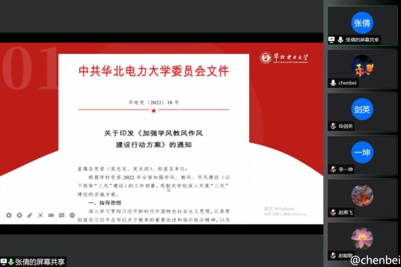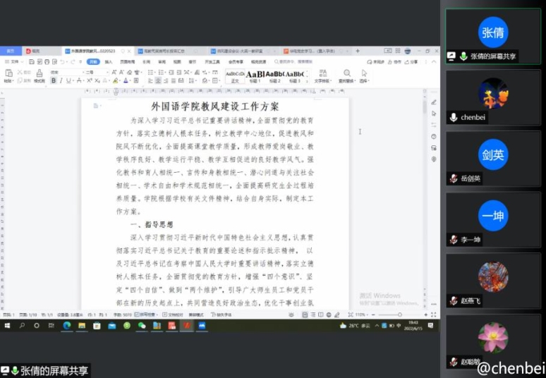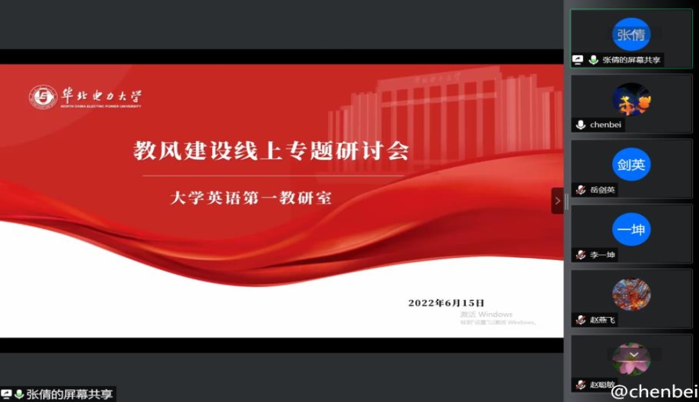为落实学校和学院教风建设的工作方案,6月15日,大学英语第一教研室全体教师通过腾讯会议召开了教风建设专题研讨会,共同学习相关文件精神,深入剖析查找问题,明确努力的方向。会议由教研室主任张倩主持,全体大学英语一教研室教师参加了会议。