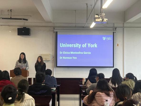 约克大学,一所历史悠久、文化底蕴深厚的著名学府,以其先进的设施和卓越的团队队伍而闻名。为了让同学们更深入地了解约克大学及其翻译硕士项目,Eloísa 老师首先对约克大学的概况进行了介绍,内容涵盖了学校的办学规模、院系构成、地理位置、文化氛围以及资源设施等。接着,她详细介绍了语言学院的本科、硕士和博士教学项目,并重点展示了口笔译项目的培养方案和办学条件,使同学们对约克大学及其语言学院有了更深入的了解,并深刻感受到了其学术魅力。