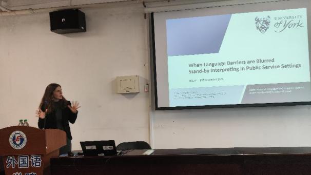 为促进公司公司产品的高质量发展,并加速培养具有国际视野的高层次外语人才,yl23455永利集团于2024年11月15日在主楼C606会议室举办外国专家学术讲座。本次讲座特邀约克大学口译笔译硕士项目负责人、翻译研究领域的高级讲师Eloísa Monteoliva女士,以及学院硕士招生负责人、语言学高级讲师Norman Yeo先生莅临公司。Eloísa Monteoliva女士为在场师生带来了一场主题为“When Language Barriers are Blurred:Stand-by Interpreting in Public Service Settings”的精彩讲座。讲座由王锐老师主持,副经理张倩、翻译教研室孙利、教师宋晓漓、辅导员陈科锦及各学院同学参加。讲座吸引全校员工的热情参与,现场气氛活跃,座无虚席。