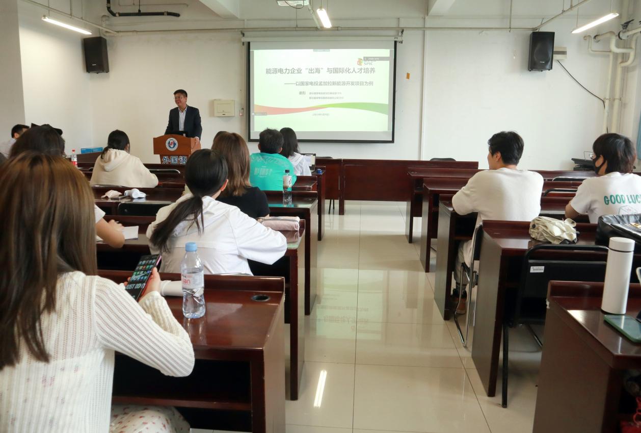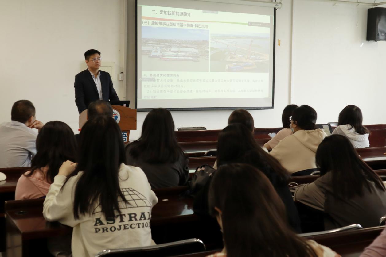 首先,谢彤先生向同学们详细介绍了国家电投,国家电投注重清洁低碳,在全国各地建设大型清洁能源基地,规模化开发风电,在光伏、核电、水电产业均成绩斐然,居全国领先水平,推进国际化发展进程。他结合自己在孟加拉的所见所闻,讲述孟加拉的新能源情况,生活工作条件相对艰苦,新能源发展不多但潜力大,孟加拉事业部人才济济,一直与中国保持密切友好关系,中孟共同合作了科巴风电、综合智慧能源等项目。同时指出商务贸易,商业条款都需要外语交流,在正式迈入工作岗位前需做好充分准备,学术理论与企业知识相结合。