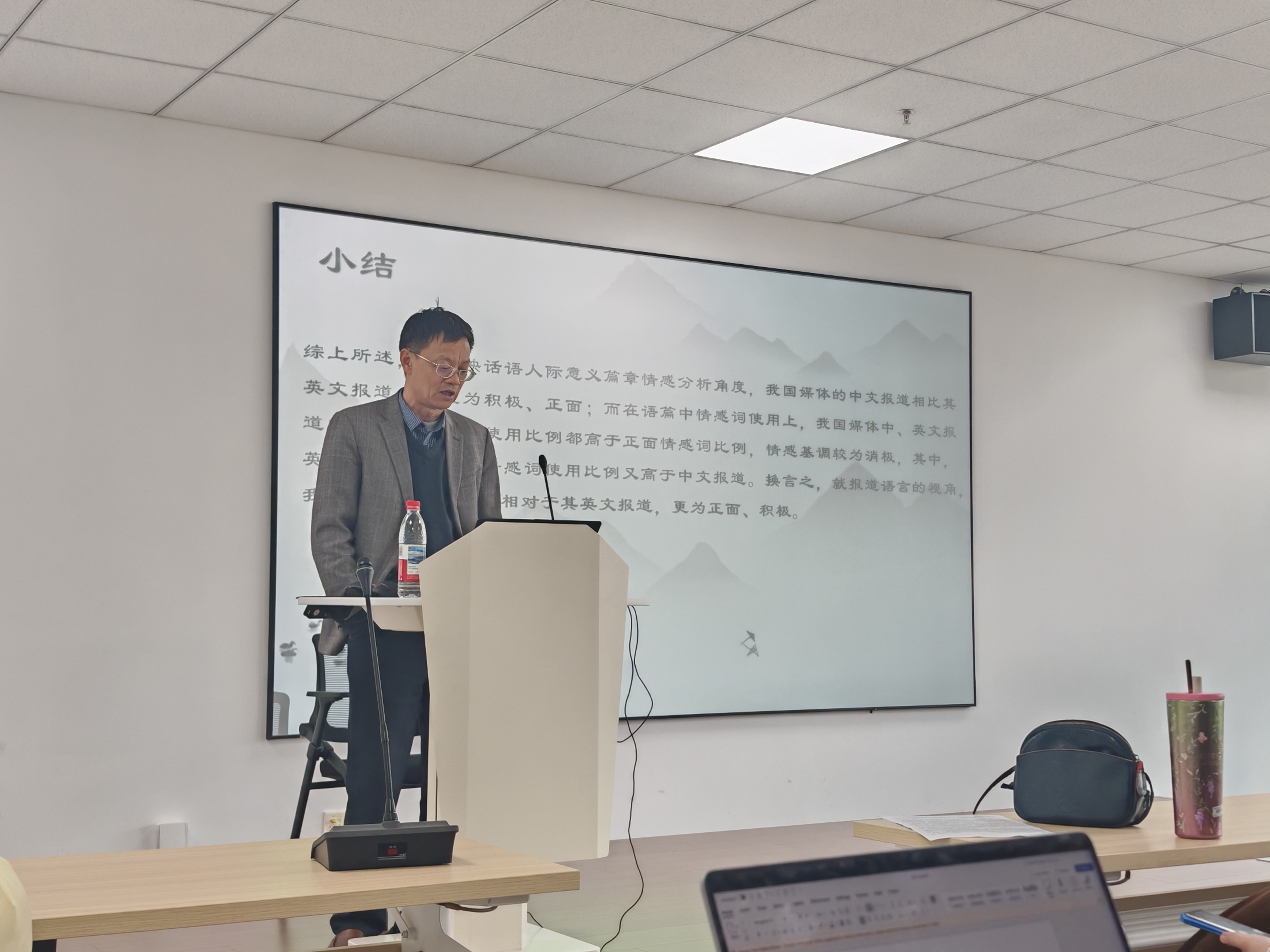 该讲座的内容分为五个部分。首先,司显柱教授在引言部分概述我国对外新闻英译话语特征分析。其次,通过引用中、日和第三方媒体之间针对国际关系问题的新闻报道,司显柱教授从篇章主题分布、高频词,篇章情感角度切入,分析了我国对外新闻英译话语相对于汉语新闻话语的语言特征,得出中国媒体的中文报道相对于其英文报道,更为正面与积极的结论。再次,司显柱教授进行了功能路径翻译的理论概述,指出新闻翻译不得脱离语言的语境与文化。