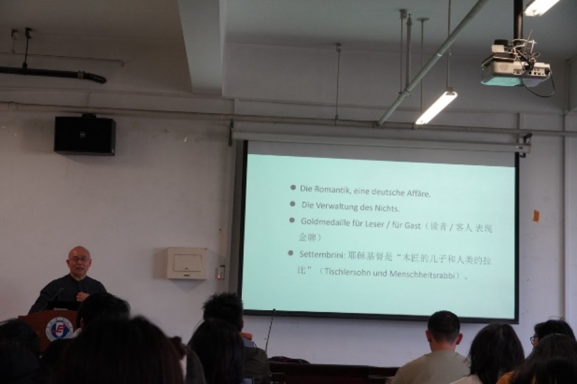 黄教授首先以托马斯·曼、赖希·拉尼茨基和马丁·瓦尔泽为代表人物,扼要地介绍了三者在德国文学史中的重要地位,以及三者思想之间的紧密关联。在介绍三者之间的关系之后,黄教授提出了本次讲座的核心问题:文学语言与非文学语言的界限在哪里?黄教授借助多个翻译实例,就该问题展开了阐释。黄教授指出,思想密度大、思想弯道多,是德国作家的典型特征。德国文学向来都是文思和哲思的神秘合一。真正的文学语言,是思想者的语言。因此,在翻译德国文学作品的过程中,译者不仅能够享受知识上的丰收,而且能够享受翻译过程中思维训练所带来的快乐。