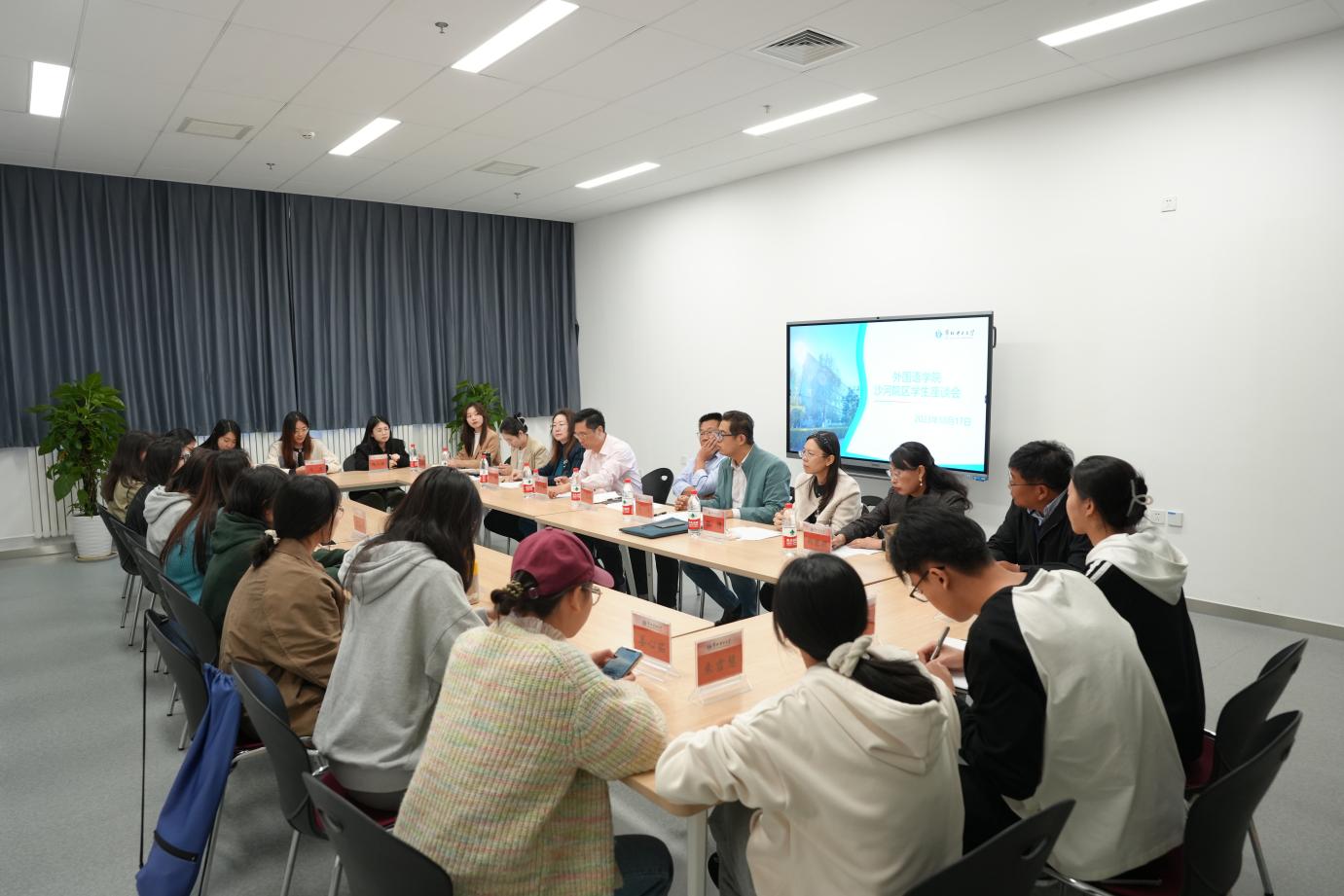 会议伊始,马冬向沙河院区同学们依次介绍了到会的各位老师,向同学们传达学院领导和老师对于沙河院区同学们的关心和问候。接着,与会同学围绕入学以来课程学习、课余活动和生活需求等方面与老师们进行交流分享。针对同学们提出的问题和困惑,学院和沙河院区的老师们耐心细致地予以解答,帮助同学们疏解成长困惑,解决合理诉求。