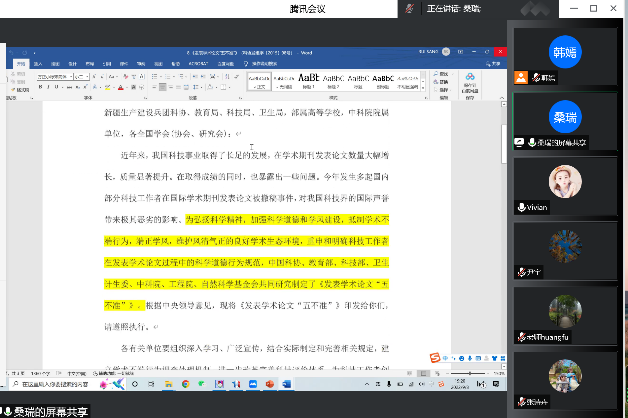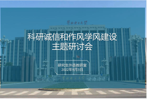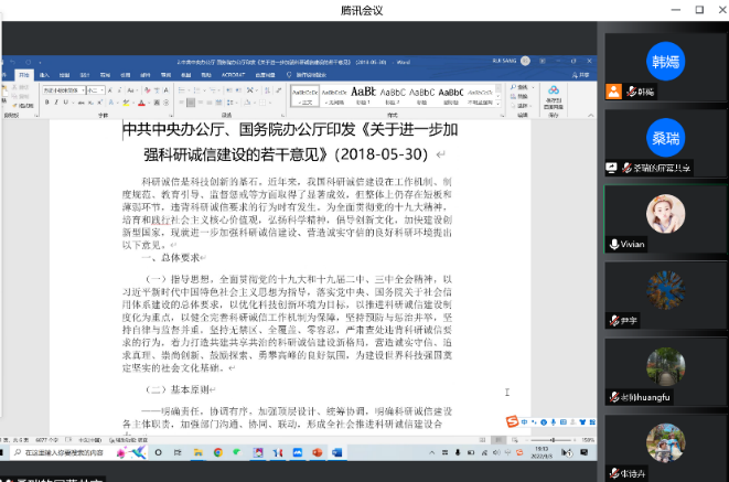 按照学校《关于开展科研诚信与作风学风建设专项整治活动的通知》的要求,研究生外语教研室于2022年9月03日晚以腾讯会议的方式组织学习了《科研诚信和作风学风建设相关文件》,同时开展主题研讨会,全体教研室在岗教师参加了会议。会议由教研室主任高晓薇主持,由教研室副主任桑瑞、韩嫣进行文件领读。