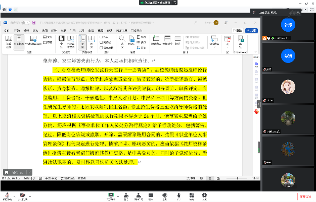 会议第二项由教研室副主任桑瑞与韩嫣老师分别针对“科研诚信规范与处理”、“作风学风建设与师德失范行为处理机制”两大板块进行文件细读。桑瑞老师整理介绍了有关科研诚信违规与失信等活动的处理规定,并带领全体教师阅读了“发表学术论文‘五不准’”原则,对各类失信行为进行了界定。韩嫣老师为全体教师导读了“新时代高校教师职业行为的十项准则”,并介绍了教育部目前在针对高校教师师德失范行为处理方面所设立的监管机制与惩处办法
