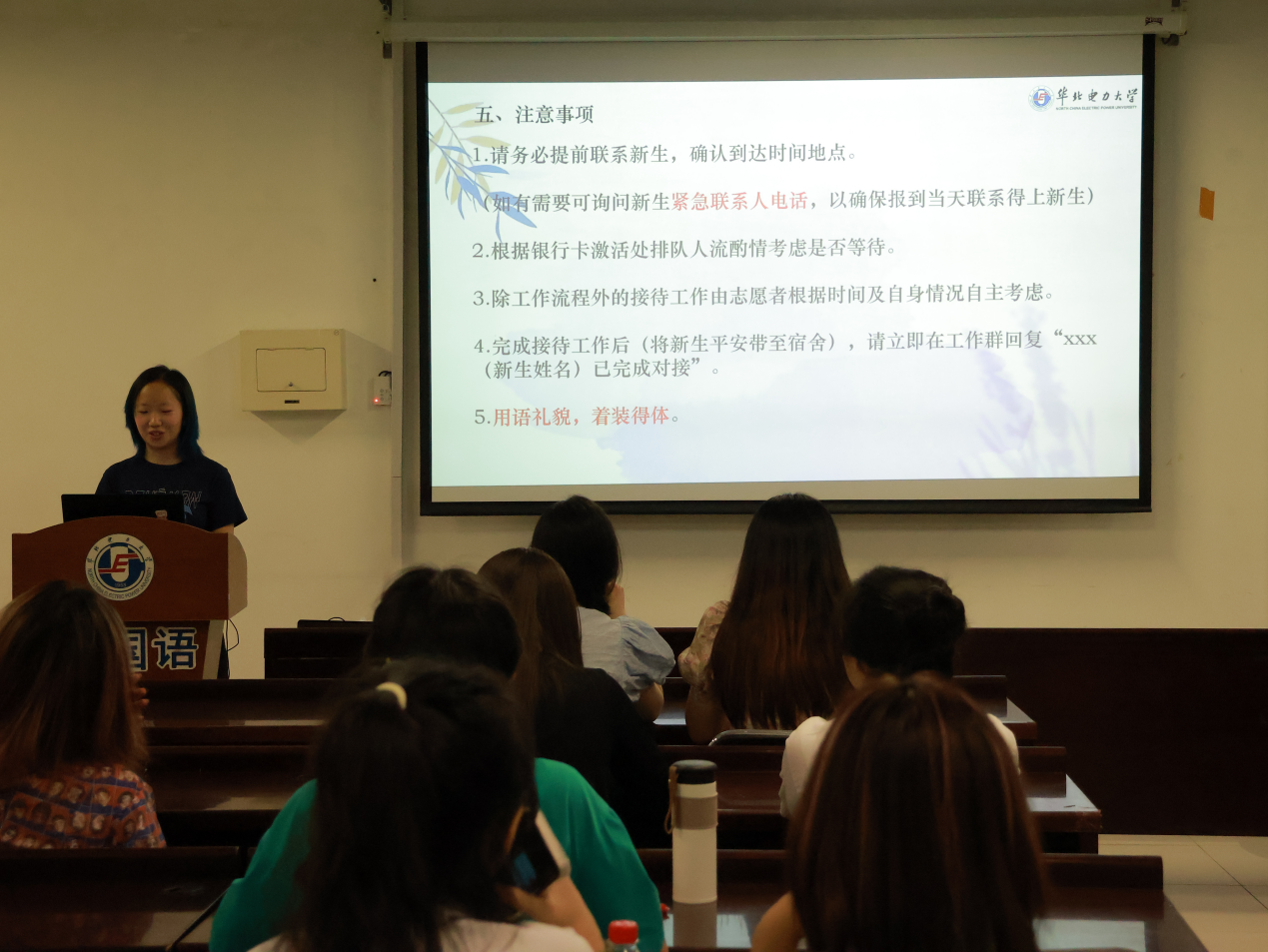 接着,会议围绕迎新工作中需要注意的各项事宜进行进一步提醒,重点包括志愿者的仪容仪表、言行举止以及热情周到的服务态度等,同时提醒全体志愿者们工作中遇到的问题请及时与学院迎新工作组沟通上报。
