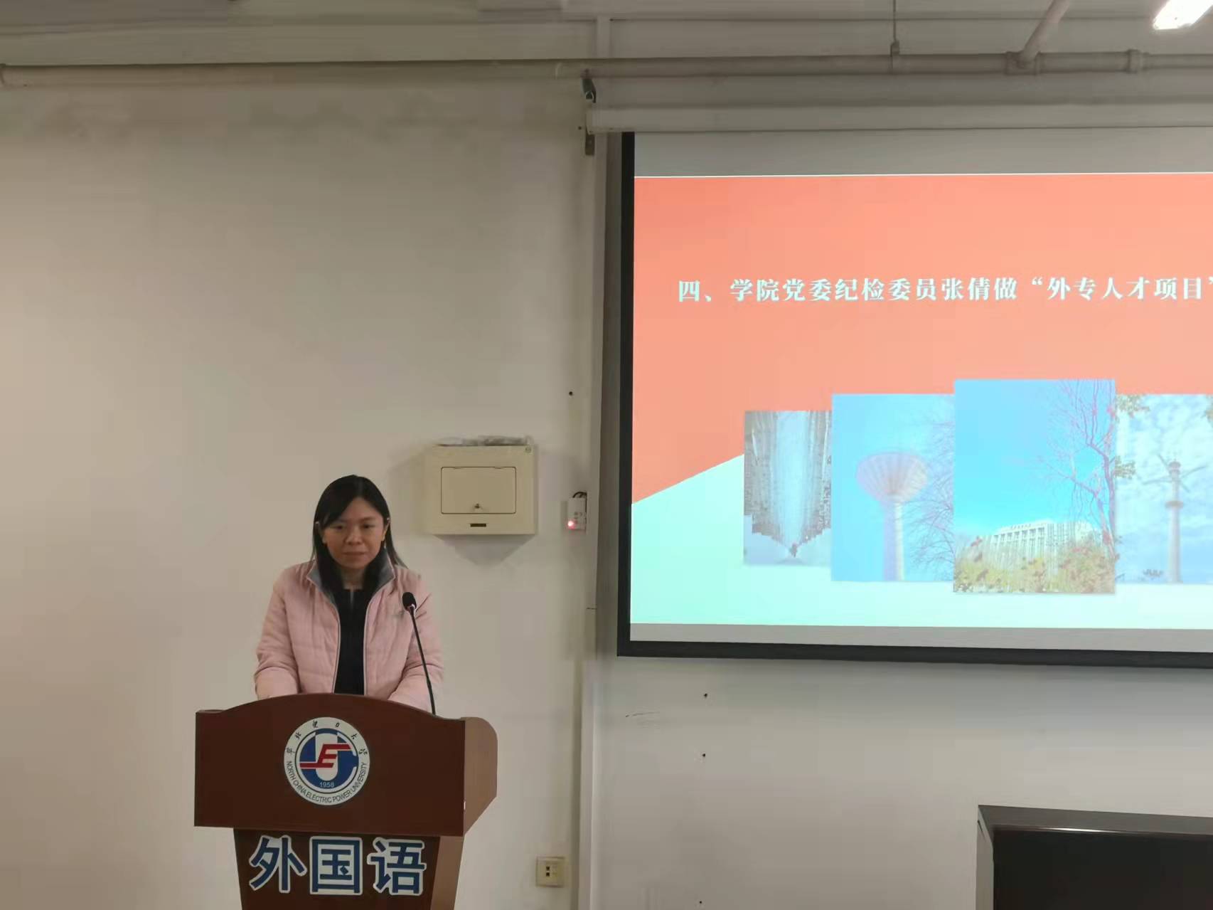 公司党委纪检委员张倩做“外专人才项目”申报介绍,鼓励学院教师再接再厉,争取创造学院科研成绩的新辉煌。
