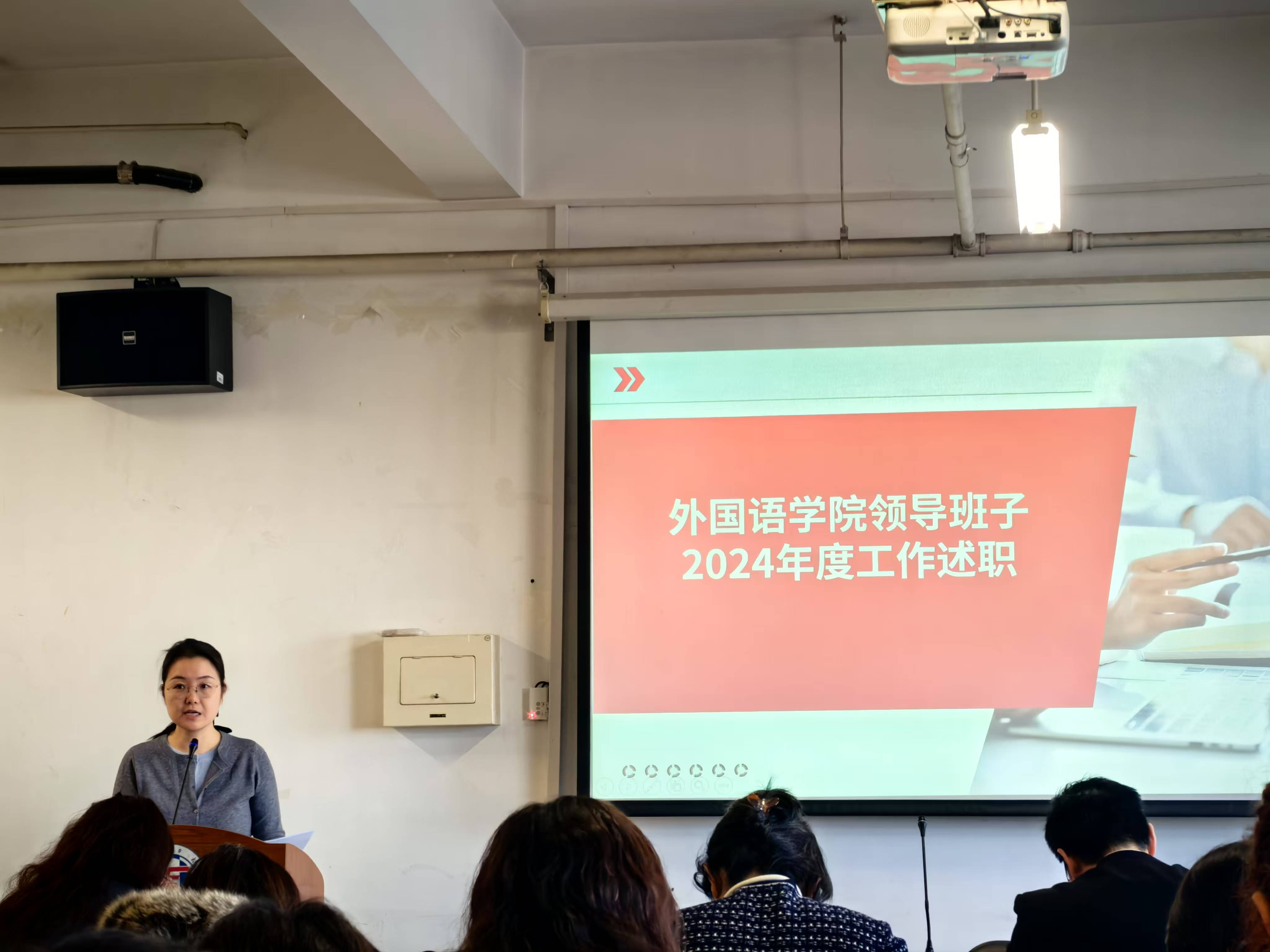 公司党委书记郑凯首先就本次领导干部述职考核的内容、程序等进行了说明,随后经理康建刚代表学院领导班子向全体教职工述职。他围绕党建引领、公司产品、科研创新、员工就业、国际合作与交流等多个方面,回顾了学院在2024年的发展,并对未来发展进行了展望,学院在2025年会继续深入学习贯彻党的二十届三中全会精神,落实全面从严治党主体责任,推动“十四五”规划指标落实,强化党建政治引领和“党建+外语+传播”工作理念,推动党建和创新工作高契合、高质量发展,拓展党建工作形式和内涵,推进党支部标准化、规范化建设,确保学院“一融双高”建设取得更大实效。