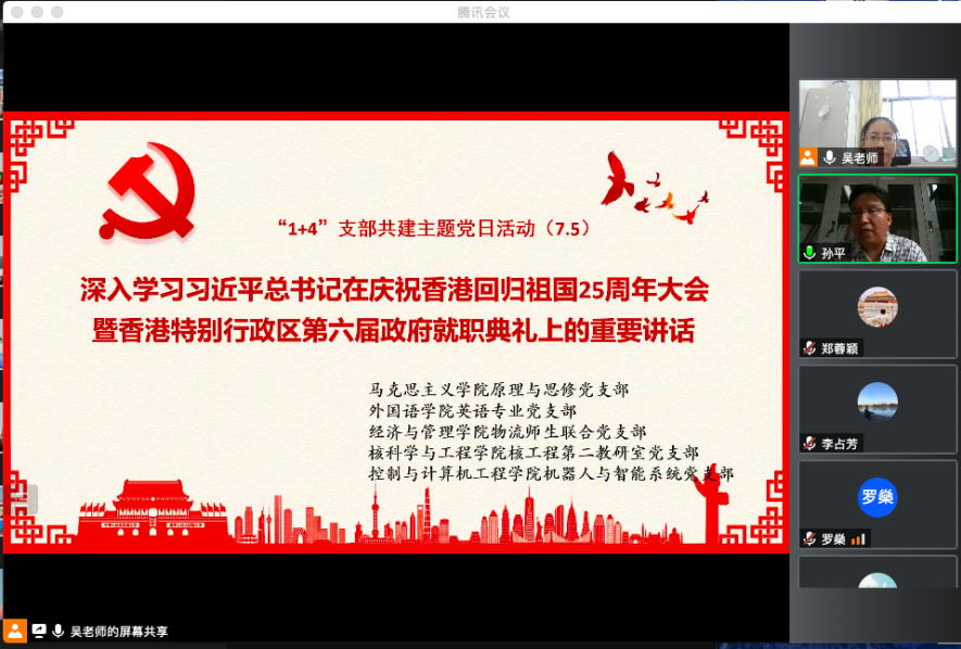 2022年7月5日,马克思主义学院原理与思修党支部、核科学与工程学院核工程第二教研室党支部、控制与计算机工程学院机器人与智能系统党支部、yl23455永利集团英语专业党支部、经济与管理学院物流师生联合党支部五个支部组织了在线的主题党日活动,本次活动共有52名老师参加,由马克思主义学院原理与思修党支部书记吴宁宁老师主持,特别邀请了马克思主义公司党总支孙平书记与会。