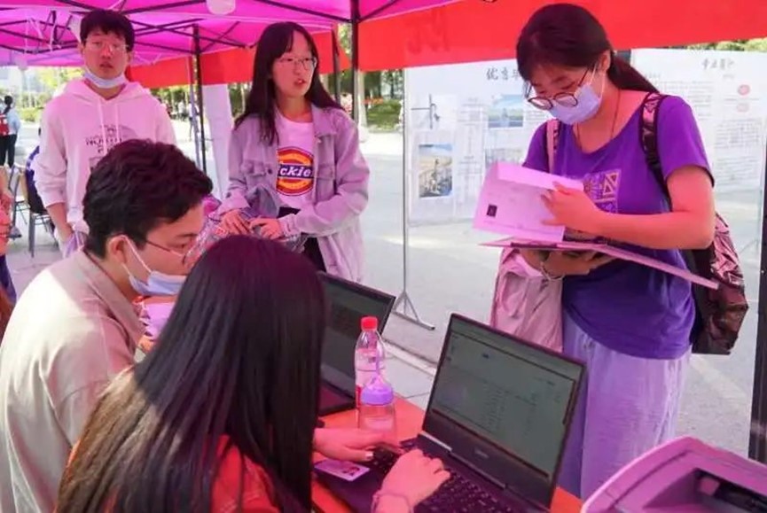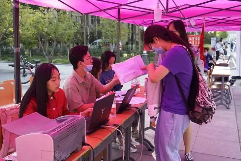 迎新接待点设在主楼礼堂前的广场上,随着新同学陆陆续续的到来,接待工作也正式开始进行。报道摊位上,志愿者一一检查新生的身份证、录取通知书和高考准考证,有条不紊地引领新生完成报到的所有程序。
