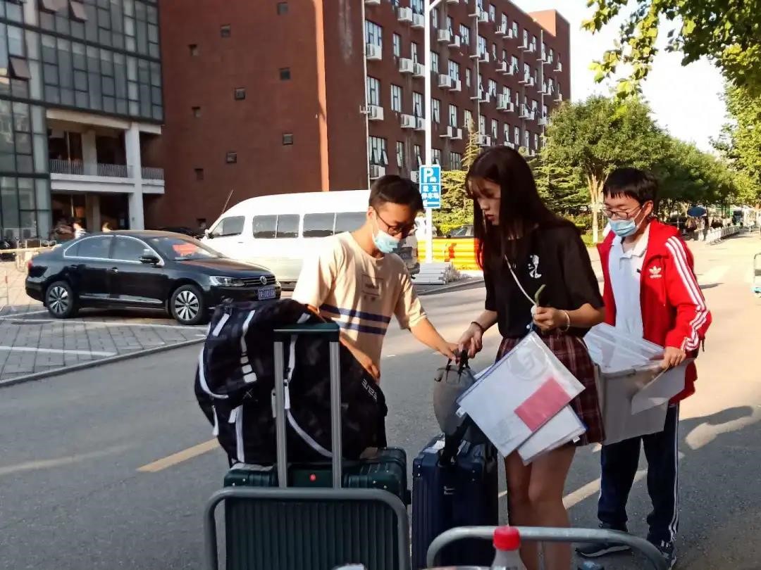 行李领取处的接待也是井然有序的。由于今年疫情的特殊原因,新生家长不能入校,新生所有的行李由学校志愿者统一运送至教五楼下,再由本人领取。考虑到新生对学校环境并不熟悉,再加上行李搬运等问题,学院在行李领取处配有志愿者。志愿者负责将每一名到来的新生及其行李送到宿舍,并留下志愿者的电话号码,让新生有需要的时候可及时联系,全部安置好之后志愿者才离开。