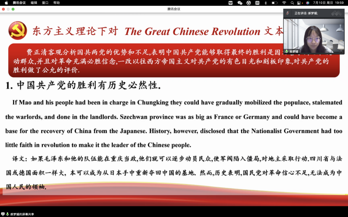 文学组代表郝梦媛从东方主义理论的视角进行文本解读,以中国共产党的胜利有历史必然性和中国共产党深深扎根在中国优秀传统文化之中两方面为切入点,表现了费正清相对客观分析国共两党的优势和不足,表明中国共产党能够取得最终胜利是因为善于团结和发动群众,并且对革命充满必胜信念,一改以往西方帝国主义对共产党的有色目光和刻板印象,对共产党的胜利做了相对公允的评价;以及费正清作为研究中国文化的学者,对中国的优秀传统文化有着深入的了解,同时也深刻认识到这些传承了千年之久的优秀文化对中国人与中国共产党的气质与思想产生了深远影响。这种认识是对西方一直以来认为东方人是愚昧的,东方是未开化的野蛮之地,东方文化是低级的这种错误认知的有力反击。