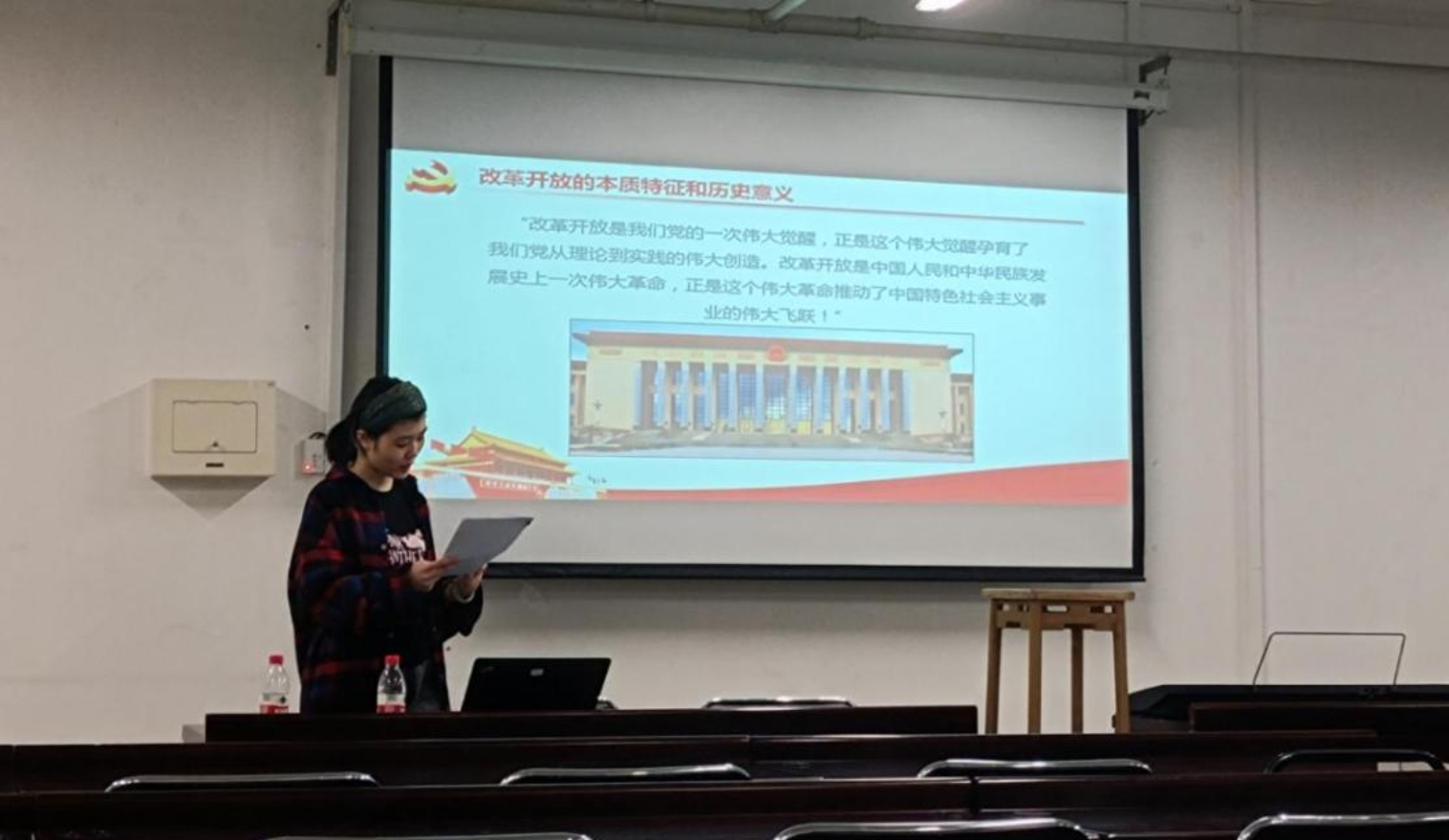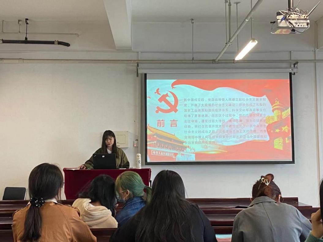 4月22日第二次活动中,陈子冉同学带来的是关于改革开放发展史的专题报告。报告分为四部分,分别对改革开放的发展、改革开放的本质特征和历史意义、改革开放的中国经验和历史启示以及改革开放给我们的未来思考进行了详细介绍。同学们深切感悟到,坚定不移走改革发展道路,牢牢把握机遇,向世界展现改革开放的光明图景,是我们当代青年的历史责任。