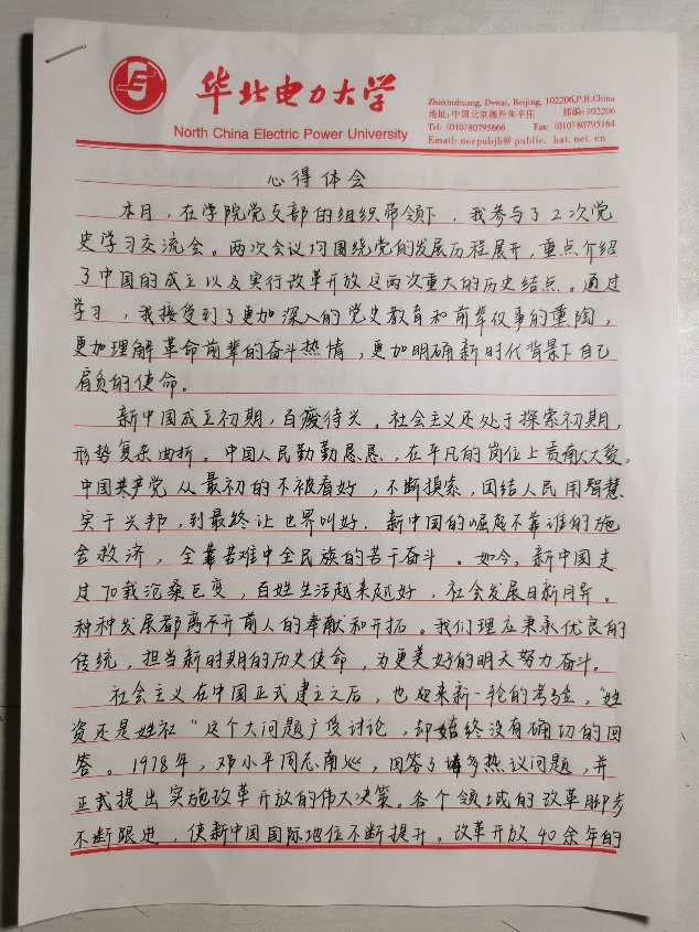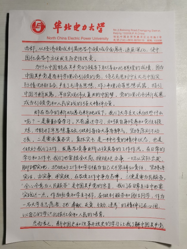 陈星羽同学认为,通过这几次党课学习,我对中国共产党的历史和精神有了更加清晰深刻的了解和认识,以史鉴今,资政育人。通过“四史”学习,我们既可以得出一些有利于党和国家发展的经验教训,也能够从中汲取精神力量、坚定理想信念。作为一名老员工,我要做的就是通过“四史”学习,了解党和新中国的发展历史,领悟党的精神,从而在生活中成为一名合格的党员,更好地服务同学。