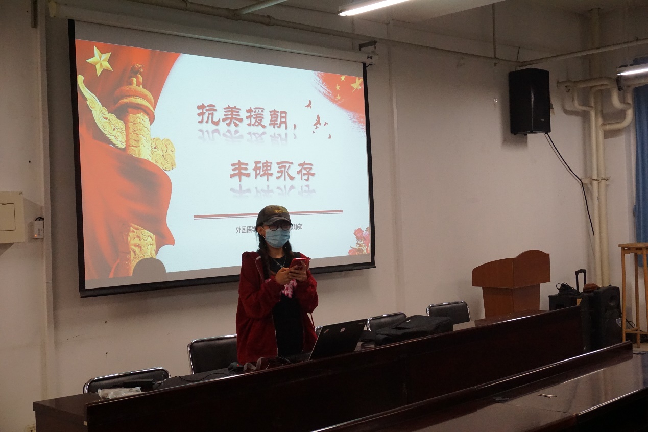 5月13日,张静茹同学担任主讲人,与同学们一起学习了抗美援朝的相关历史知识。张静茹同学详细生动地讲述了战争的前因后果、过程战况。通过学习这场值得载入史册的战争,我们致敬先烈,铭记历史,热爱和平。